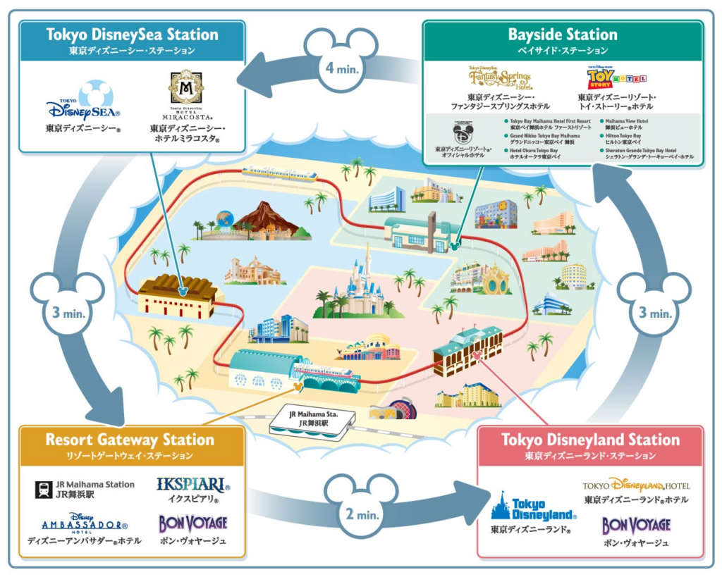 ディズニーリゾートラインを利用してホテルに行く場合、JR舞浜駅からは『リゾートゲートウェイ・ステーション』から乗車することができますし、各パークにも駅が設置されています。