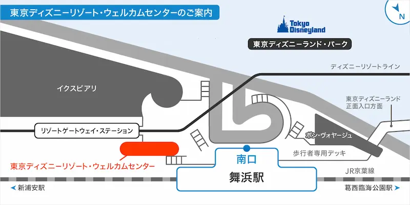 ウェルカムセンターは、JR舞浜駅を降りてイクスピアリ側すぐの場所にあります。